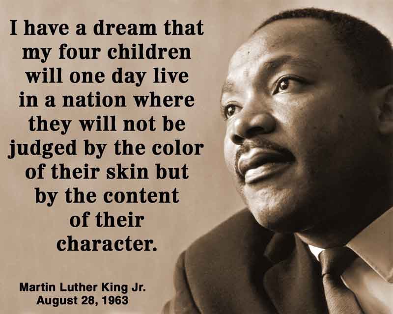 I have a dream that my four little children will one day live in a nation where they will not be judged by the color of their skin but by the content of their character.”
